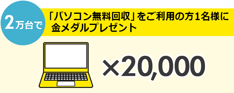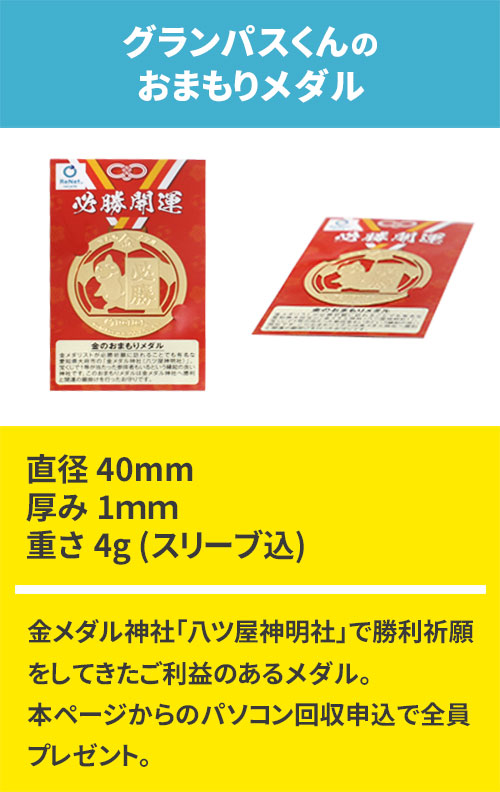 | 概 要 | 期間中にこのページからパソコン回収をご利用いただいた方全員に、必勝!金のおまもりメダルをプレゼントします。お1人様1回のみの特典となります。 |
