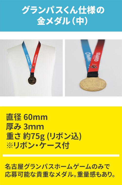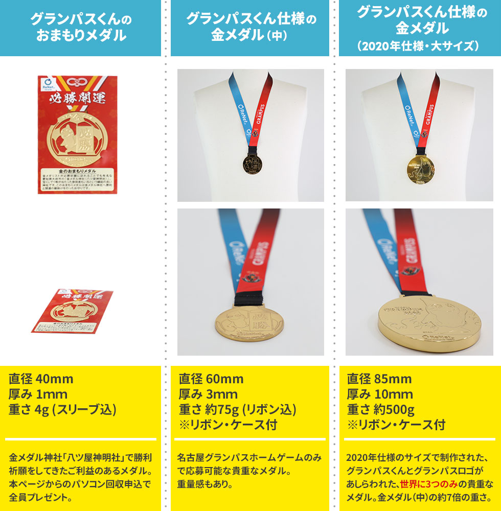 | 概 要 | 期間中に愛知県内および専用HP等からお申込み頂いたパソコンの台数に応じて、最大3名の方に金メダルを進呈します。 ※1名はグランパスのチーム得点王へのプレゼント |