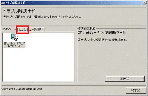 「トラブル解決ナビ」が起動したら「リカバリ」タブをクリック