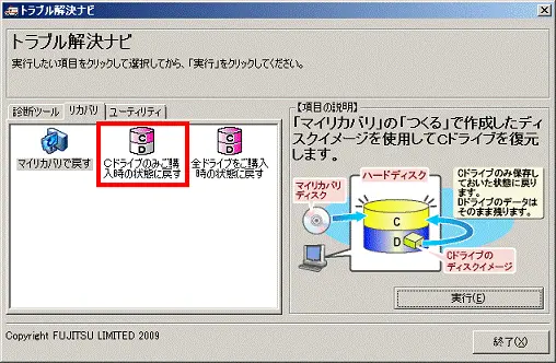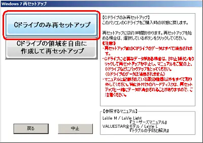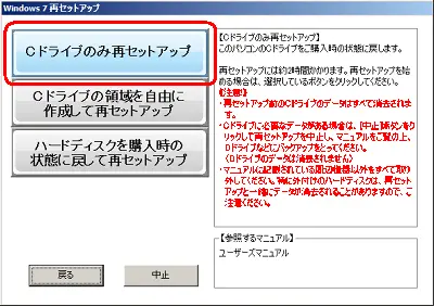 「Cドライブのみご購入時の状態に戻す」アイコンをクリック
