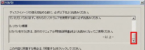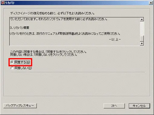 「ディスクイメージの復元を始める前に、必ず以下をよくお読みください。」と表示されるので、注意事項の内容をよく読み、同意する場合は、「同意する」をクリック