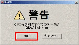 「Cドライブ内のすべてのデータが削除されます !!!」と表示されたら、「OK」ボタンをクリック