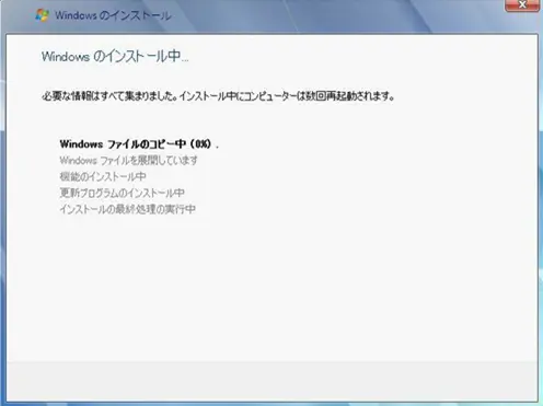 「次へ」をクリックすると、「Windowsのインストール中」が表示されるのでしばらく待つ