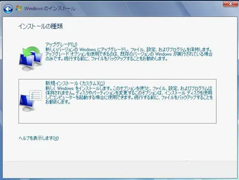 言語選択画面が表示されたら、[使用する言語は日本語です]をクリックし、[Windowsのインストール]画面が表示されたら「言語、時刻、通貨、およびキーボードの設定」を確認し 問題がなければ「次へ」をクリック