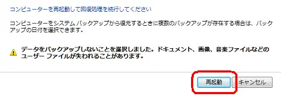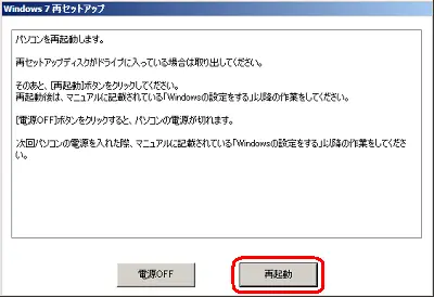 下図のようなメッセージが表示されたら、再セットアップディスクを取り出し、「再起動」をクリック