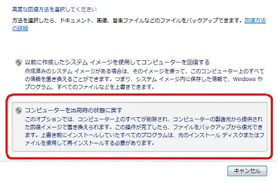 回復オプションを利用すれば、ディスクやCDなしでもWindows7を初期化できます。メーカーによって内蔵されたオプション名や手順が異なるため、『【メーカー別】Windows7のパソコンを初期化する方法』にて手順をご確認ください。