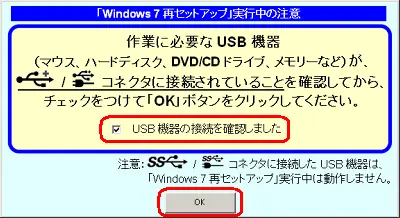 「「Windows 7再セットアップ」実行中の注意」画面が表示されたら、「USB機器の接続を確認しました」にチェックを入れて「OK」をクリック